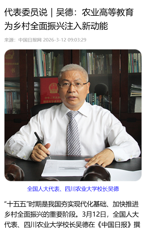 “十五五”时期是我国夯实现代化基础、加快推进乡村全面振兴的重要阶段。3月12日,全国人大代表、四川农业大学校长吴德在《中国日报》撰文指出,农业高等教育是服务“三农”事业的重要力量。扎根巴蜀大地120年的四川农业大学,始终坚持立德树人、强农兴农,在新时代背景下将进一步推动教育、科技与人才一体发展,把科研成果转化为乡村振兴的现实动力,为农业农村现代化提供坚实支撑。