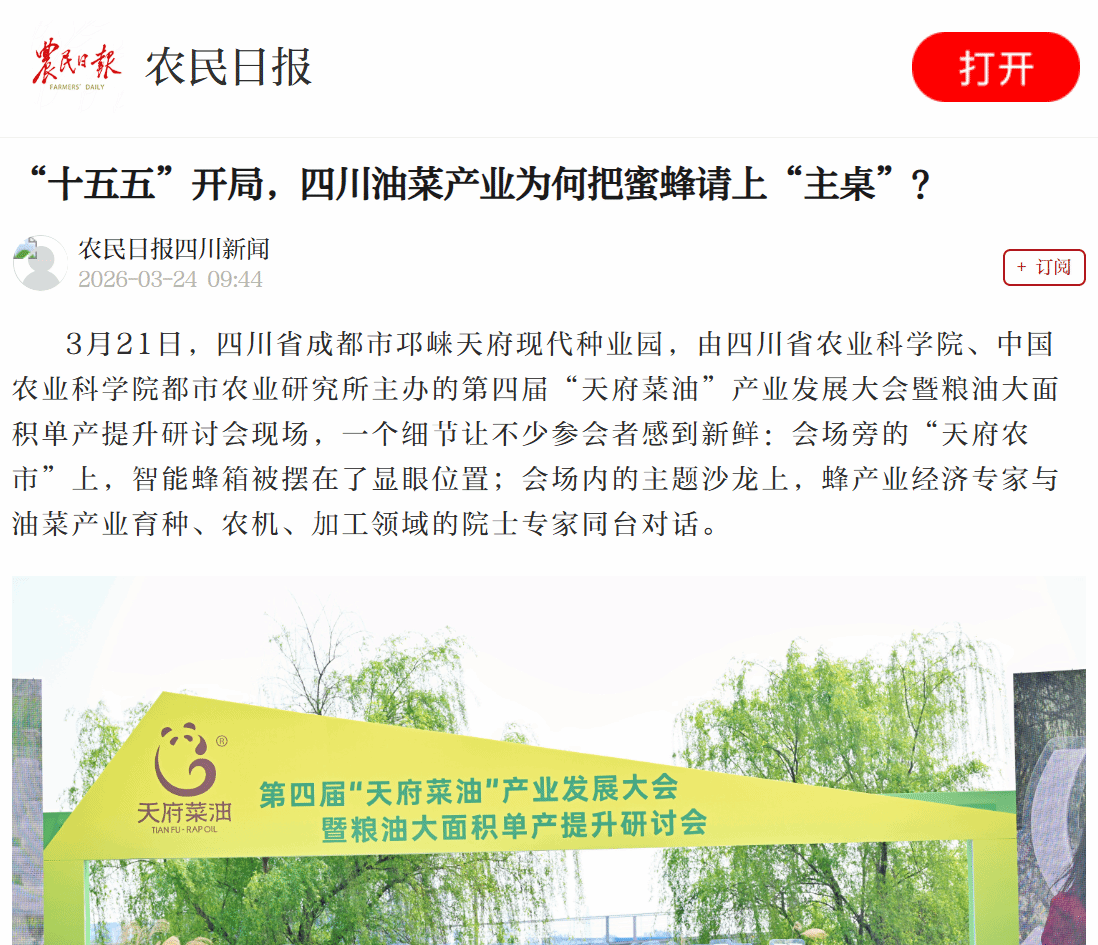 3月21日,四川省成都市邛崃天府现代种业园,由四川省农业科学院、中国农业科学院都市农业研究所主办的第四届“天府菜油”产业发展大会暨粮油大面积单产提升研讨会现场,一个细节让不少参会者感到新鲜:会场旁的“天府农市”上,智能蜂箱被摆在了显眼位置;会场内的主题沙龙上,蜂产业经济专家与油菜产业育种、农机、加工领域的院士专家同台对话。