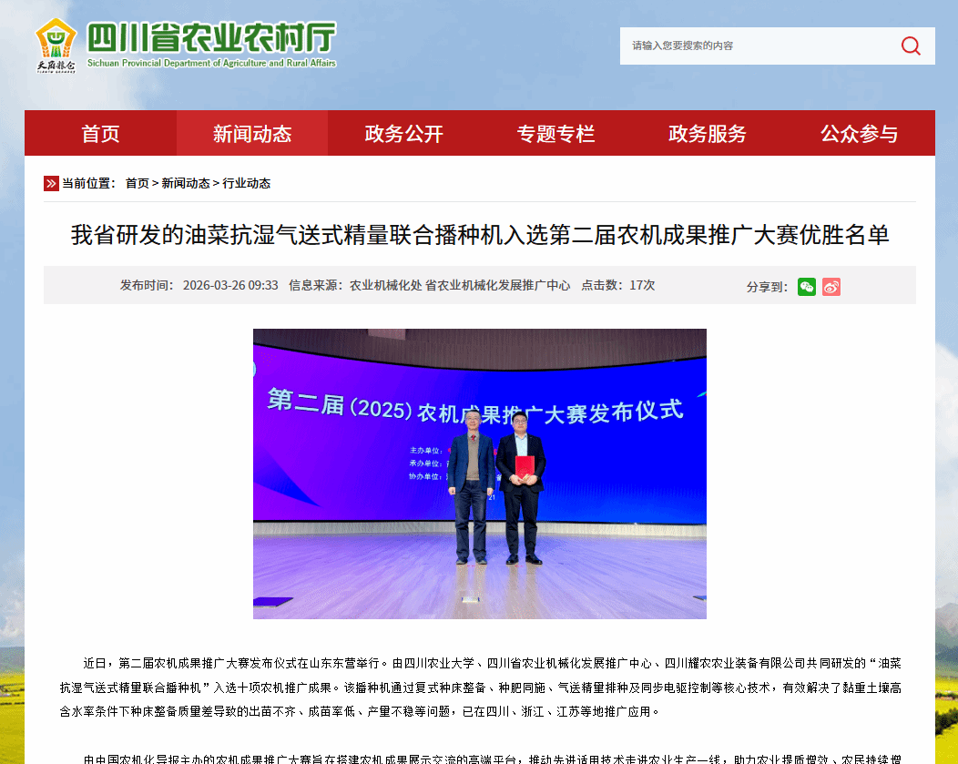 近日,第二届农机成果推广大赛发布仪式在山东东营举行。由四川农业大学、四川省农业机械化发展推广中心、四川耀农农业装备有限公司共同研发的“油菜抗湿气送式精量联合播种机”入选十项农机推广成果。该播种机通过复式种床整备、种肥同施、气送精量排种及同步电驱控制等核心技术,有效解决了黏重土壤高含水率条件下种床整备质量差导致的出苗不齐、成苗率低、产量不稳等问题,已在四川、浙江、江苏等地推广应用。