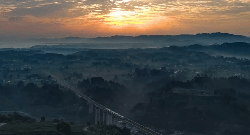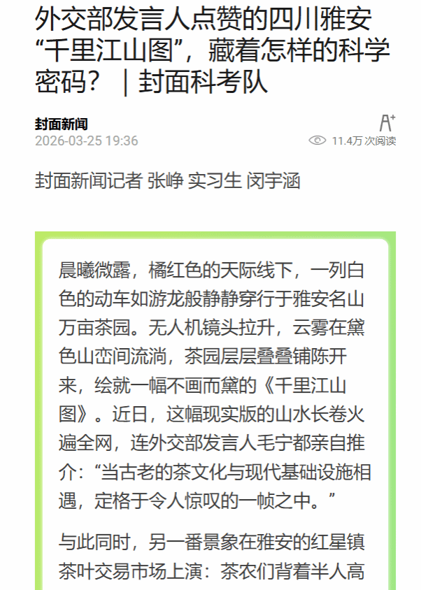 晨曦微露,橘红色的天际线下,一列白色的动车如游龙般静静穿行于雅安名山万亩茶园。无人机镜头拉升,云雾在黛色山峦间流淌,茶园层层叠叠铺陈开来,绘就一幅不画而黛的《千里江山图》。近日,这幅现实版的山水长卷火遍全网,连外交部发言人毛宁都亲自推介:“当古老的茶文化与现代基础设施相遇,定格于令人惊叹的一帧之中。”