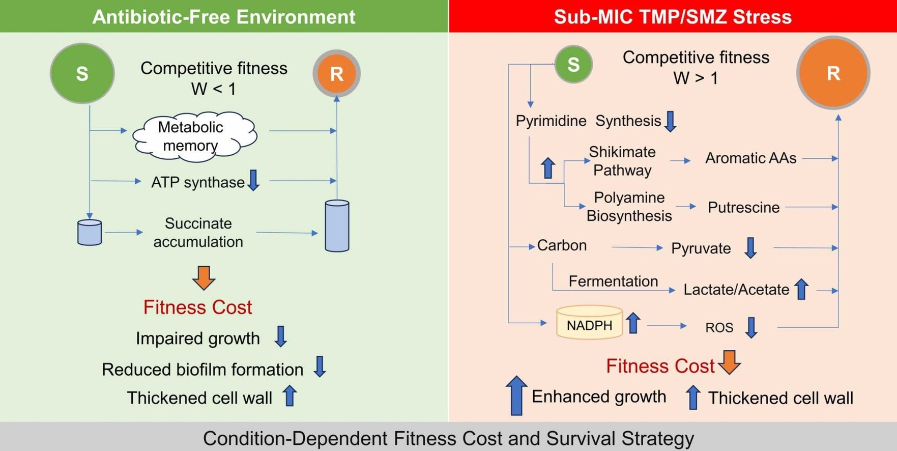 团队对这一机制进行了更深层次的探索。他们首次系统阐明了甲氧苄啶/磺胺甲噁唑(TMP/SMZ)耐药大肠杆菌的“双面生存策略”。研究发现,在完全没有抗生素的环境中,耐药菌为维持其抗性需要付出巨大的“适应性代价”,表现为生长缓慢、竞争能力弱,很快被敏感菌淘汰。然而,一旦环境中存在哪怕极低浓度(亚抑制浓度)的抗生素,形势便发生逆转:敏感菌大量死亡,而耐药菌却通过一套精密的“代谢重编程”方案——关闭能量消耗大的“嘧啶合成”通路,转而激活应急生存相关的“多胺”和“抗氧化”系统——迅速占据优势,实现“绝地反击”。