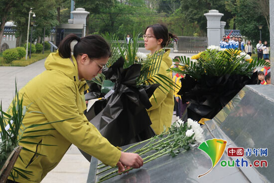 研支团成员为烈士敬献鲜花。四川农业大学研究生支教团供图