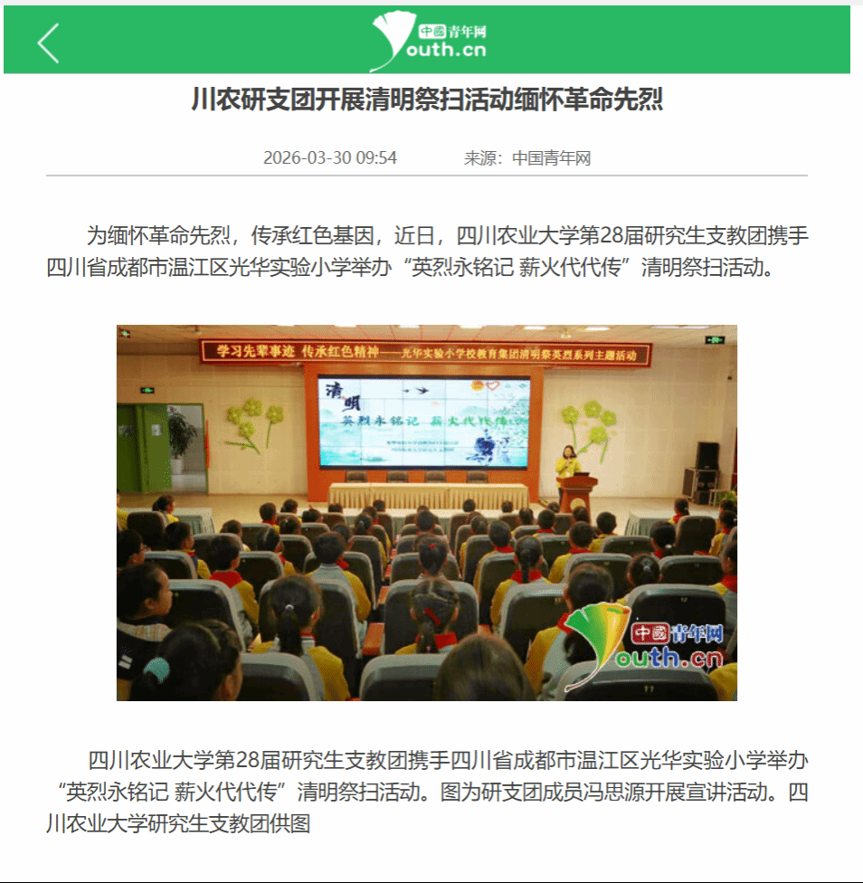 此次清明祭扫活动,不仅是一次缅怀先烈的庄重仪式,更是一场生动的爱国主义教育实践课。站在新的历史起点,四川农业大学第28届研究生支教团负责人表示,将继续发挥自身优势,联合更多学校开展红色教育活动,让红色基因融入血脉,让英烈精神薪火相传。