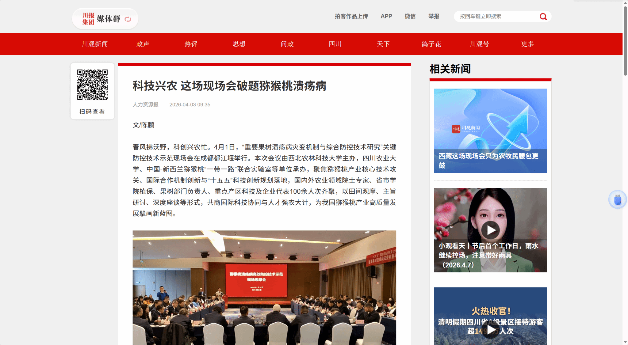 春风拂沃野,科创兴农忙。4月1日,“重要果树溃疡病灾变机制与综合防控技术研究”关键防控技术示范现场会在成都都江堰举行。本次会议由西北农林科技大学主办,四川农业大学、中国-新西兰猕猴桃“一带一路”联合实验室等单位承办,聚焦猕猴桃产业核心技术攻关、国际合作机制创新与“十五五”科技创新规划落地,国内外农业领域院士专家、省市学院植保、果树部门负责人、重点产区科技及企业代表100余人次齐聚,以田间观摩、主旨研讨、深度座谈等形式,共商国际科技协同与人才强农大计,为我国猕猴桃产业高质量发展擘画新蓝图。