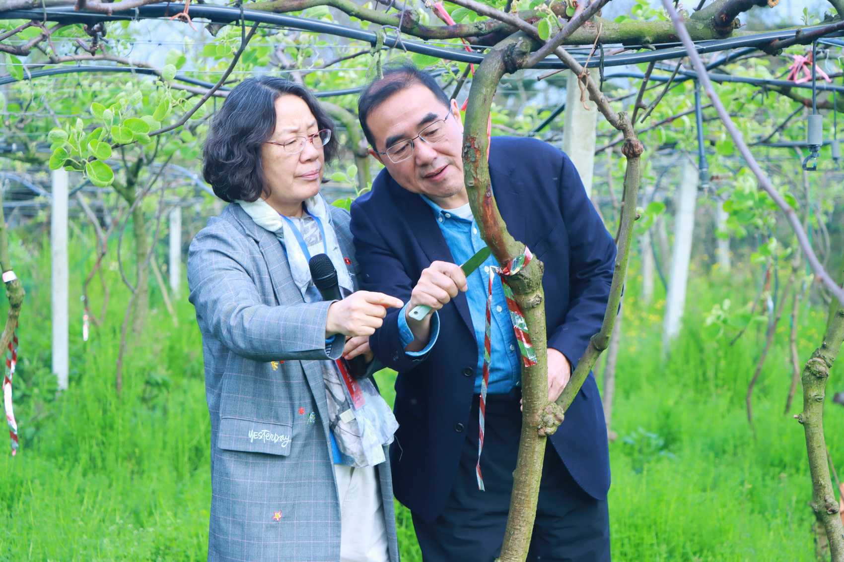 溃疡病素有猕猴桃“癌症”之称,潜伏性强、传播快、防控难,长期制约全球猕猴桃产业发展。在常规防治园,西北农林科技大学黄丽丽教授现场剖析病害机理与传统防控短板,自深耕果树病害研究三十余年来,她带领团队构建起“基础研究—技术研发—示范推广”三位一体体系,直击传统防控成本高、效果差、易污染的痛点。都江堰多位种植户在现场分享了亲身经历,从最初因溃疡病暴发而几近绝望,到在黄丽丽教授专家团队的持续指导下,果园重焕生机,病害得到有效控制,亩产恢复至2吨以上。通过实地考察与交流,专家们对溃疡病绿色高效防控技术的实际成效有了全面而深入的了解。