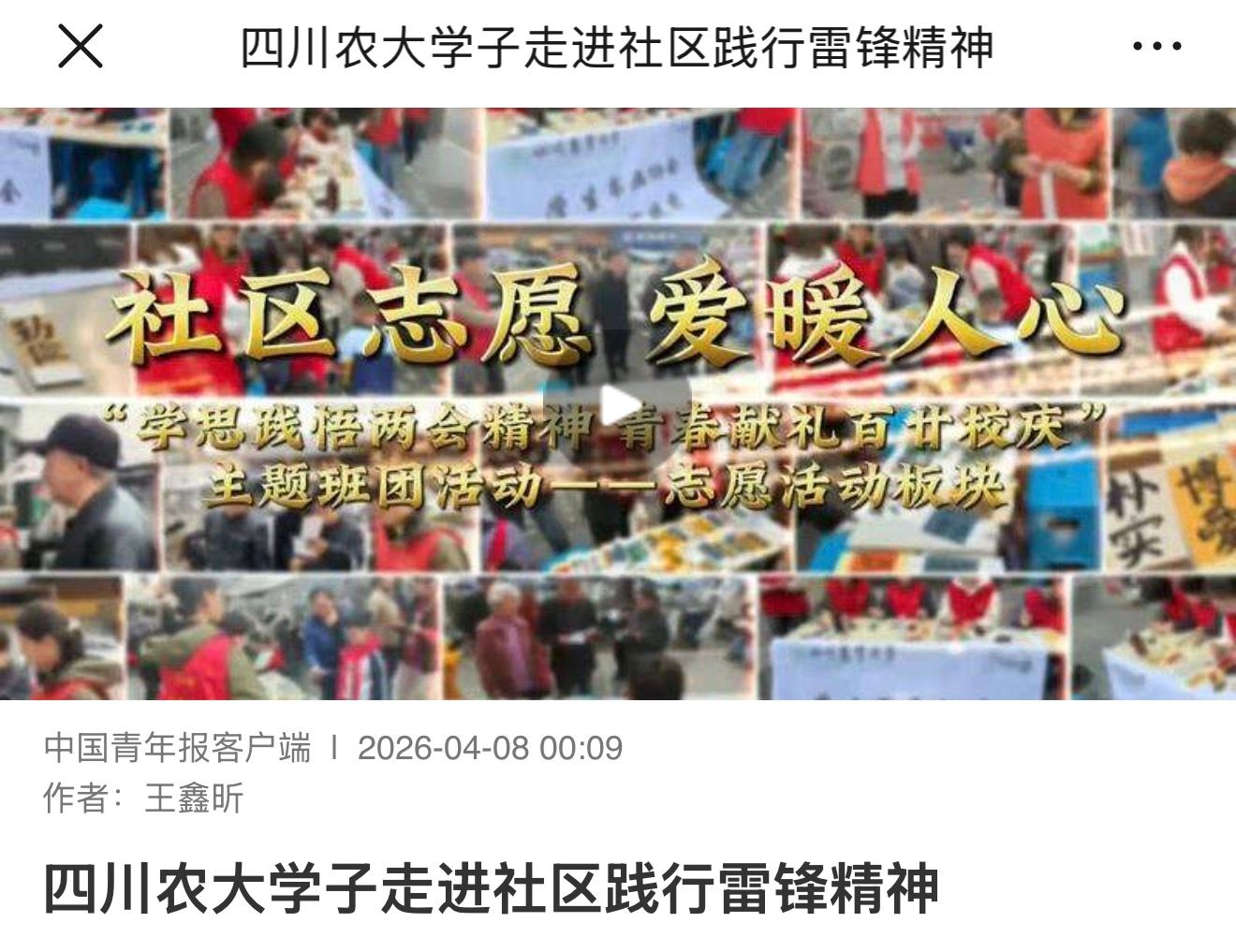 近日,在四川农业大学信息工程学院与人文学院合办的“学思践悟两会精神,青春献礼百廿校庆”主题班团活动中,川农大学子走进四川省雅安市雨城区开展学雷锋主题志愿服务,在实践中学习感悟雷锋精神。(刘沿汐 陈烨萍 视频提供:四川农业大学信息工程学院)