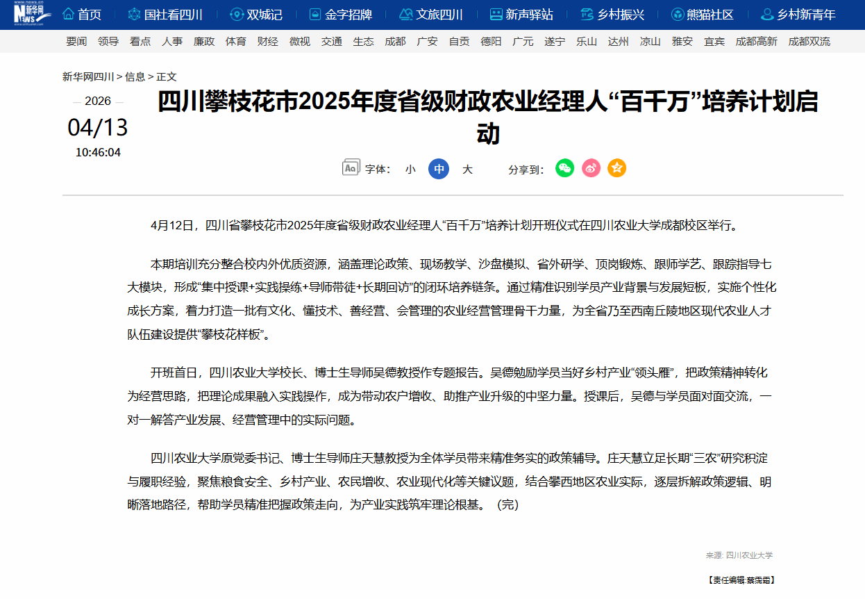 4月12日,四川省攀枝花市2025年度省级财政农业经理人“百千万”培养计划开班仪式在四川农业大学成都校区举行。