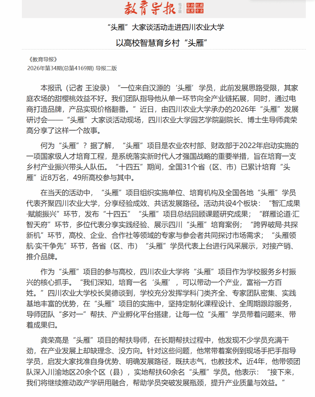 “一位来自汉源的‘头雁’学员,此前发展思路受限,其家庭农场的甜樱桃效益不好。我们团队指导他从单一环节向全产业链拓展,同时,通过电商打造品牌,产品实现价格翻番。”近日,由四川农业大学承办的2026年“头雁”发展研讨会——“头雁”大家谈活动现场,四川农业大学园艺学院副院长、博士生导师龚荣高分享了这样一个故事。