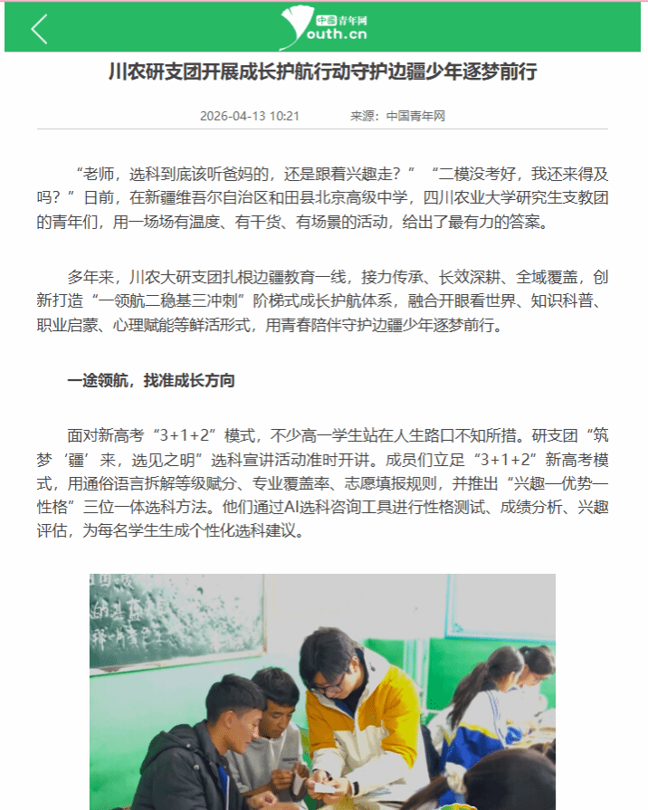 多年来,川农大研支团扎根边疆教育一线,接力传承、长效深耕、全域覆盖,创新打造“一领航二稳基三冲刺”阶梯式成长护航体系,融合开眼看世界、知识科普、职业启蒙、心理赋能等鲜活形式,用青春陪伴守护边疆少年逐梦前行。