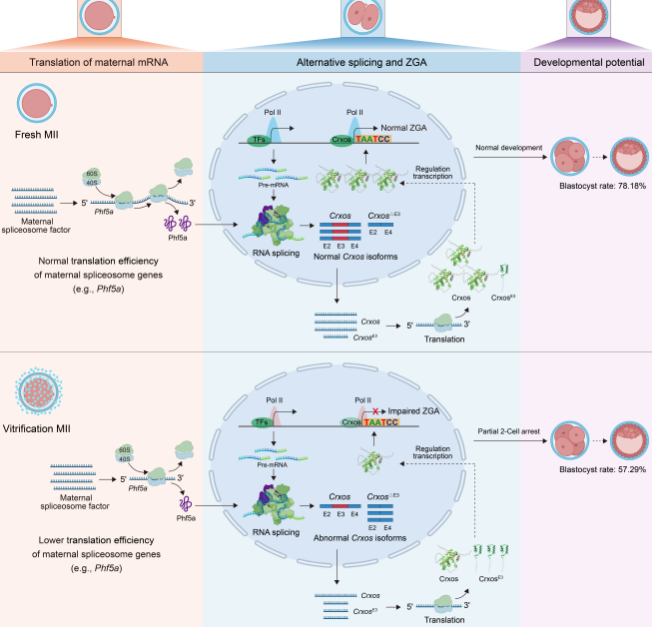 研究发现,玻璃化冷冻可显著抑制母源剪接体基因(如Phf5a)的翻译,该缺陷传递至早期胚胎,导致2细胞期出现广泛RNA可变剪接异常,关键ZGA调控因子Crxos的全长转录本Egam1第3号外显子跳跃显著增加。Crxos全长变体缺失会损害RNA聚合酶II在ZGA基因上的招募与延伸能力,降低整体转录活性,阻碍胚胎发育。