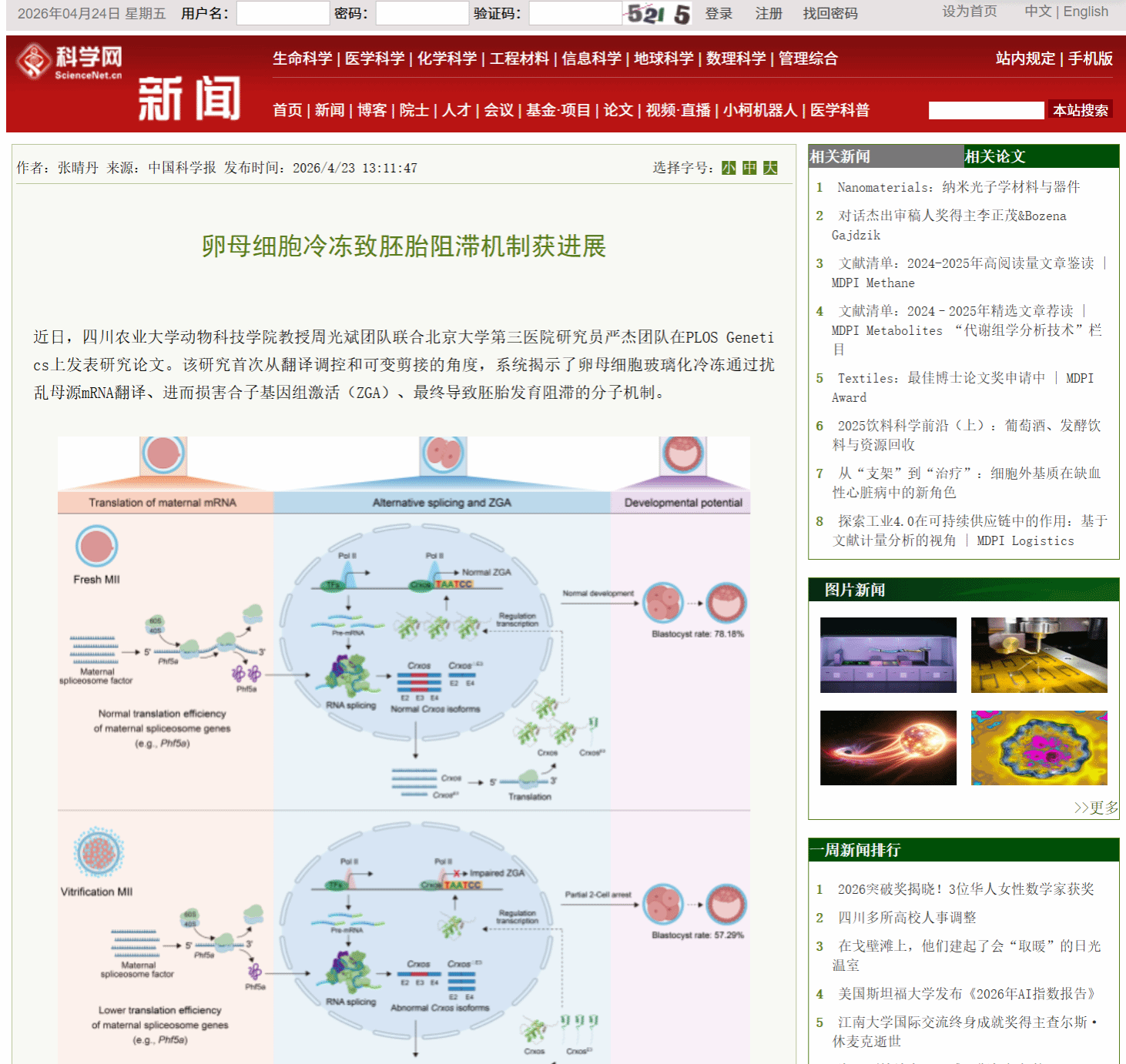 近日,四川农业大学动物科技学院教授周光斌团队联合北京大学第三医院研究员严杰团队在PLOS Genetics上发表研究论文。该研究首次从翻译调控和可变剪接的角度,系统揭示了卵母细胞玻璃化冷冻通过扰乱母源mRNA翻译、进而损害合子基因组激活(ZGA)、最终导致胚胎发育阻滞的分子机制。