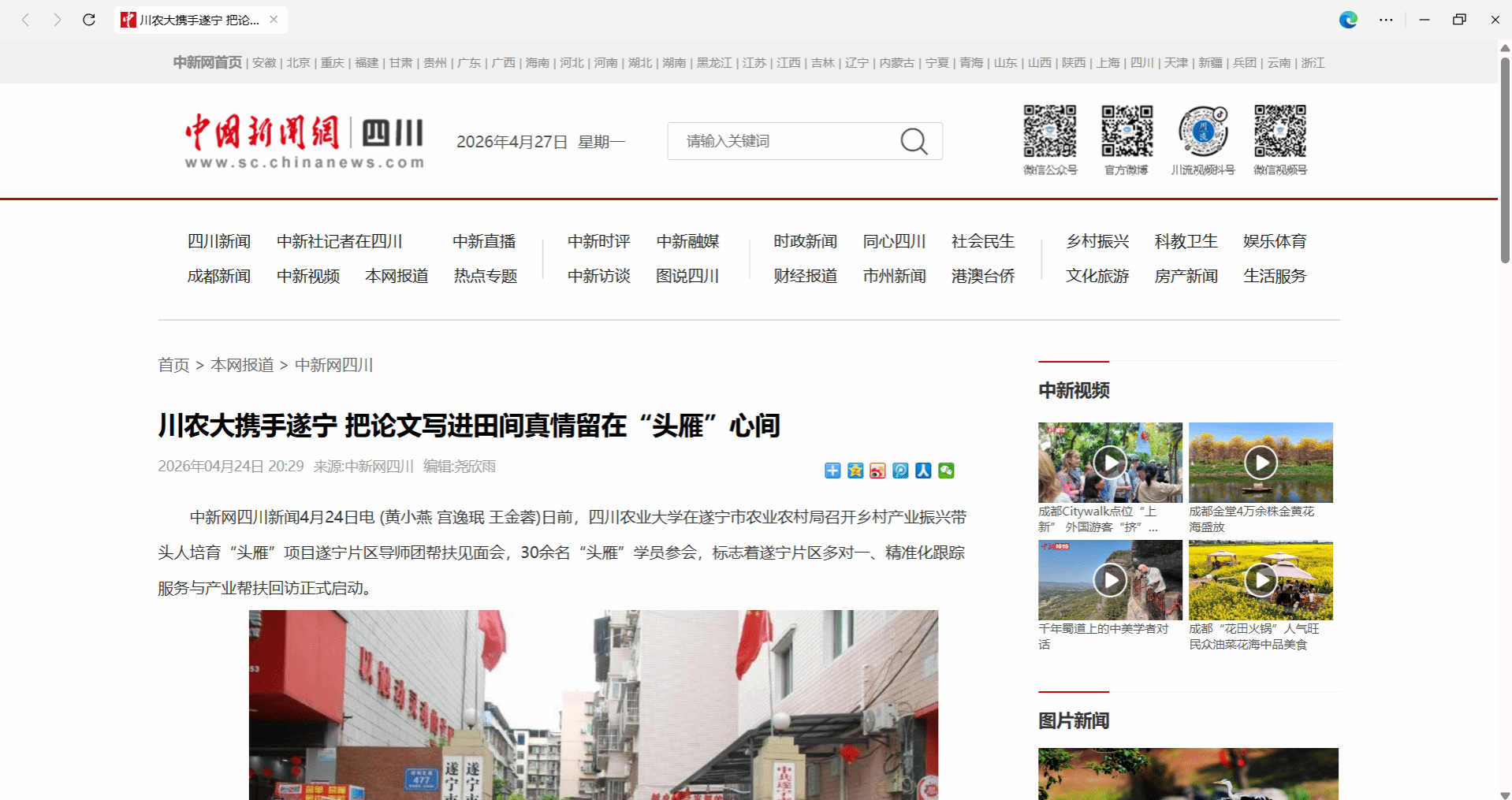 中新网四川新闻4月24日电 (黄小燕 宫逸珉 王金蓉)日前,四川农业大学在遂宁市农业农村局召开乡村产业振兴带头人培育“头雁”项目遂宁片区导师团帮扶见面会,30余名“头雁”学员参会,标志着遂宁片区多对一、精准化跟踪服务与产业帮扶回访正式启动。