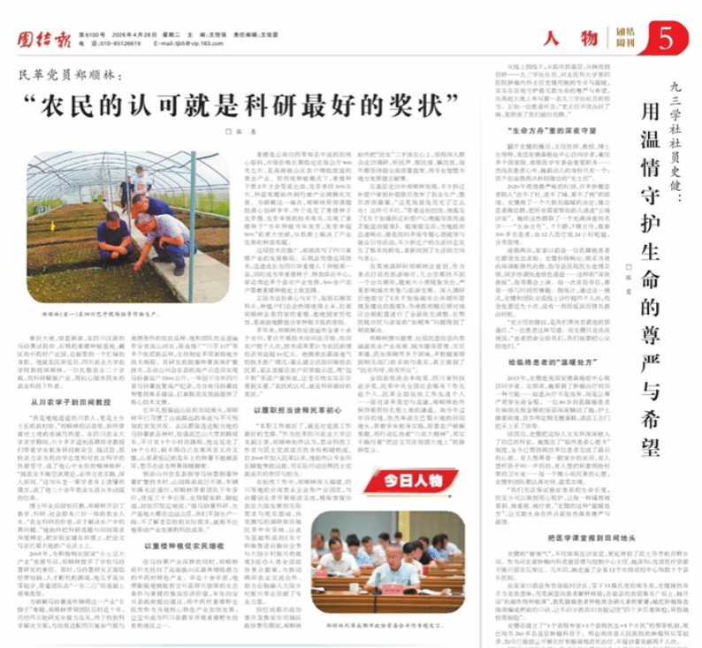 全国农牧渔业丰收奖、四川省科技进步奖、民革中央全国社会服务工作先进个人、民革全国祖统工作先进个人……面对诸多荣誉与成就,郑顺林始终保持着那份扎根土地的谦逊。如今年过半百的他,依然奔波在巴蜀大地的田间地头,带着学生躬身实践,陪着农户破解难题,用行动弘扬着“川农大精神”,用实干践行着“把论文写在祖国大地上”的铮铮誓言。