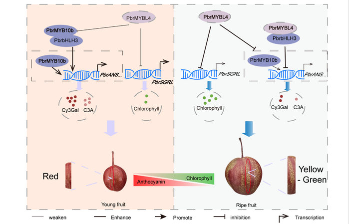 为此,研究团队首先在“红早酥”梨中挖掘出一个可同时抑制梨果皮花青苷素积累和叶绿素降解的新型R2R3-MYB转录因子PbrMYBL4。进一步研究发现,PbrMYBL4一方面直接抑制花青素苷结构基因PbrF3H和PbrANS的转录,另一方面还结合主激活基因PbrMYB10b的启动子而直接抑制花青素苷的生物合成;同时,PbrMYBL4还通过与PbrbHLH3互作形成抑制复合物来削弱PbrMYB10b-PbrbHLH3对PbrF3H和PbrANS基因的转录表达作用。此外,PbrMYBL4还直接抑制叶绿素降解关键基因PbrSGRL的转录,延缓叶绿素的降解,从而动态调控果皮色泽的变化。
