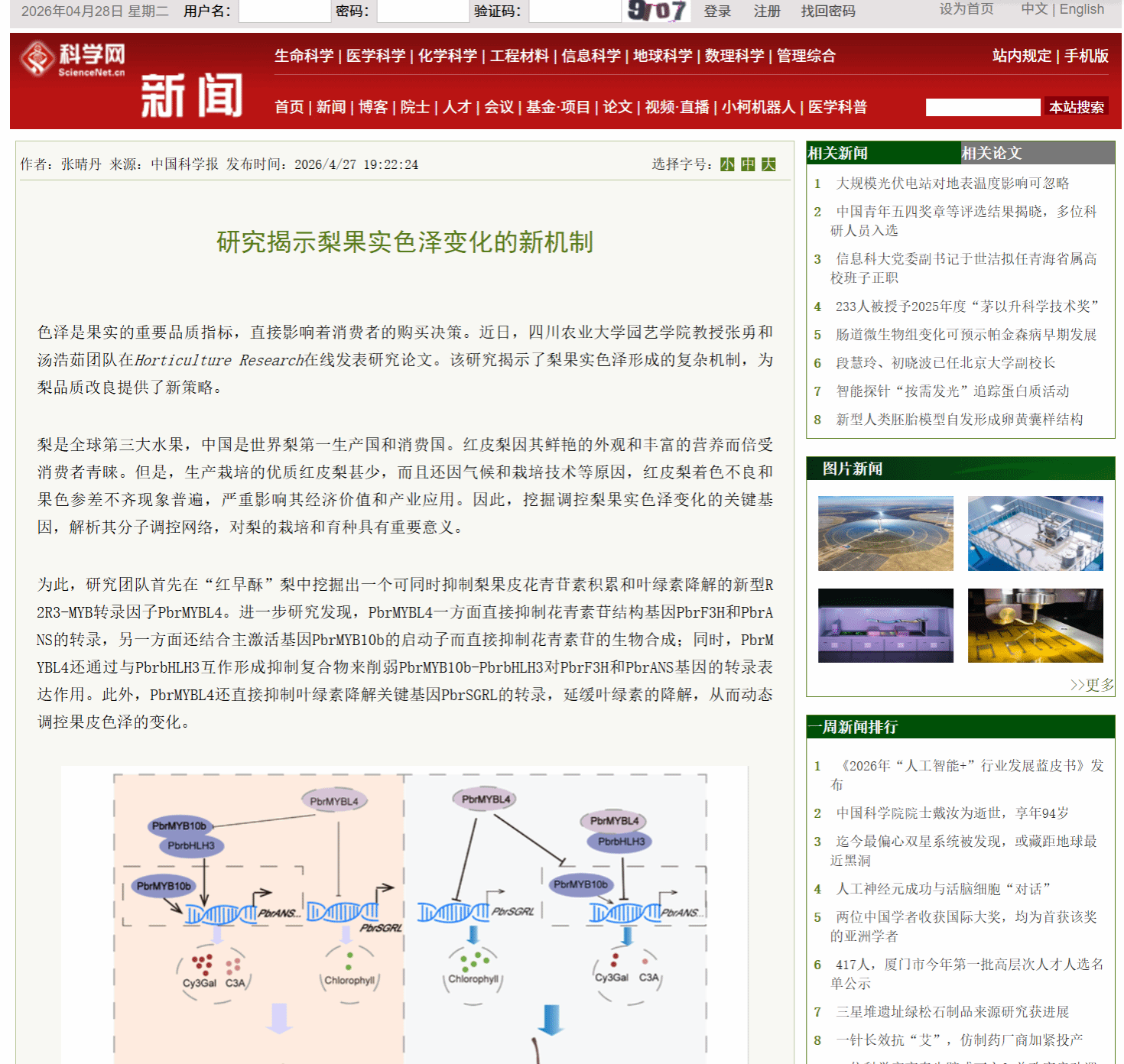 色泽是果实的重要品质指标,直接影响着消费者的购买决策。近日,四川农业大学园艺学院教授张勇和汤浩茹团队在Horticulture Research在线发表研究论文。该研究揭示了梨果实色泽形成的复杂机制,为梨品质改良提供了新策略。
