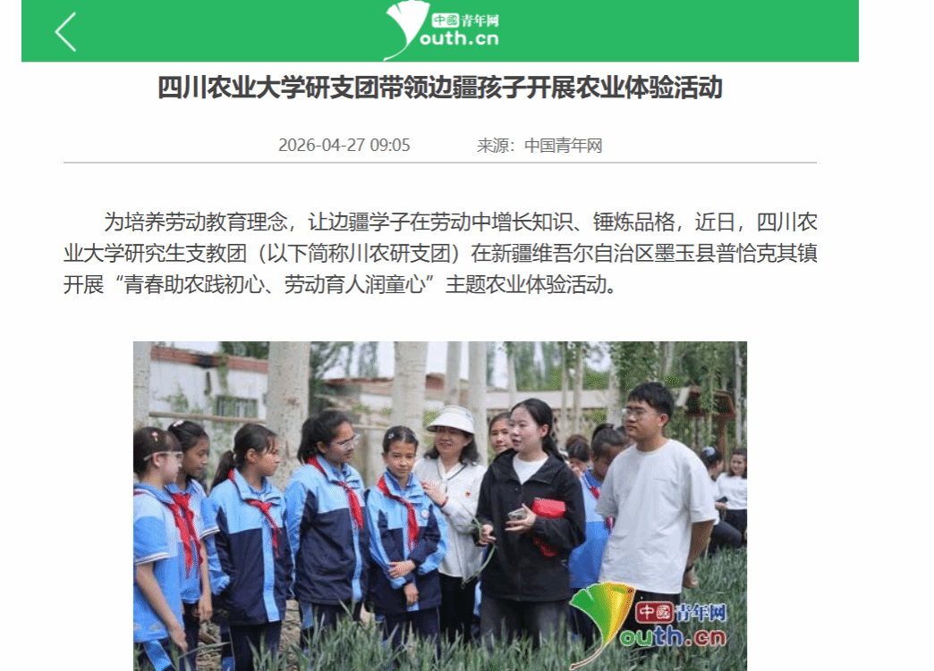 为培养劳动教育理念,让边疆学子在劳动中增长知识、锤炼品格,近日,四川农业大学研究生支教团(以下简称川农研支团)在新疆维吾尔自治区墨玉县普恰克其镇开展“青春助农践初心、劳动育人润童心”主题农业体验活动。