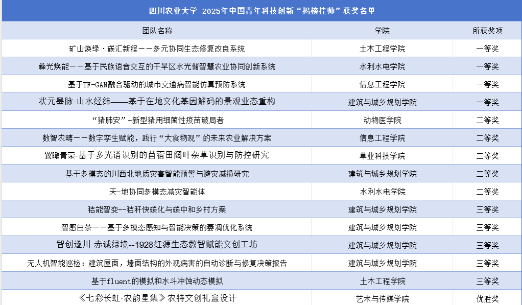 在终审决赛中,我校学子锐意进取、团结拼搏,凭借突出的创新价值与实践潜力得到参评专家的高度关注与一致肯定。来自土木工程学院《矿山焕绿·碳汇新程——多元协同生态修复改良系统》、水利水电学院《彝光焕能——基于民族语音交互的干旱区水光储智慧农业协同创新系统》、信息工程学院的《基于TF-GAN融合驱动的城市交通病智能仿真预防系统》与建筑与城乡规划学院《状元墨脉·山水经纬——基于在地文化基因解码的景观业态重构》斩获国赛一等奖;动物医学院《猪肺安——新型猪用细菌性疫病破局者》和草业科技学院《翼瞰青荣——基于多光谱识别的苜蓿田阔叶杂草识别与防控研究》等5个项目获国赛二等奖;建筑与城乡规划学院的《智感白茶——基于多模态感知与智能决策的萎凋优化系统》与土木工程学院《基于fluent的模拟和水斗冲蚀动态模拟》等5个项目获国赛三等奖;艺术与传媒学院《七彩长虹 农韵星集——农特文创礼盒设计》获优胜奖。