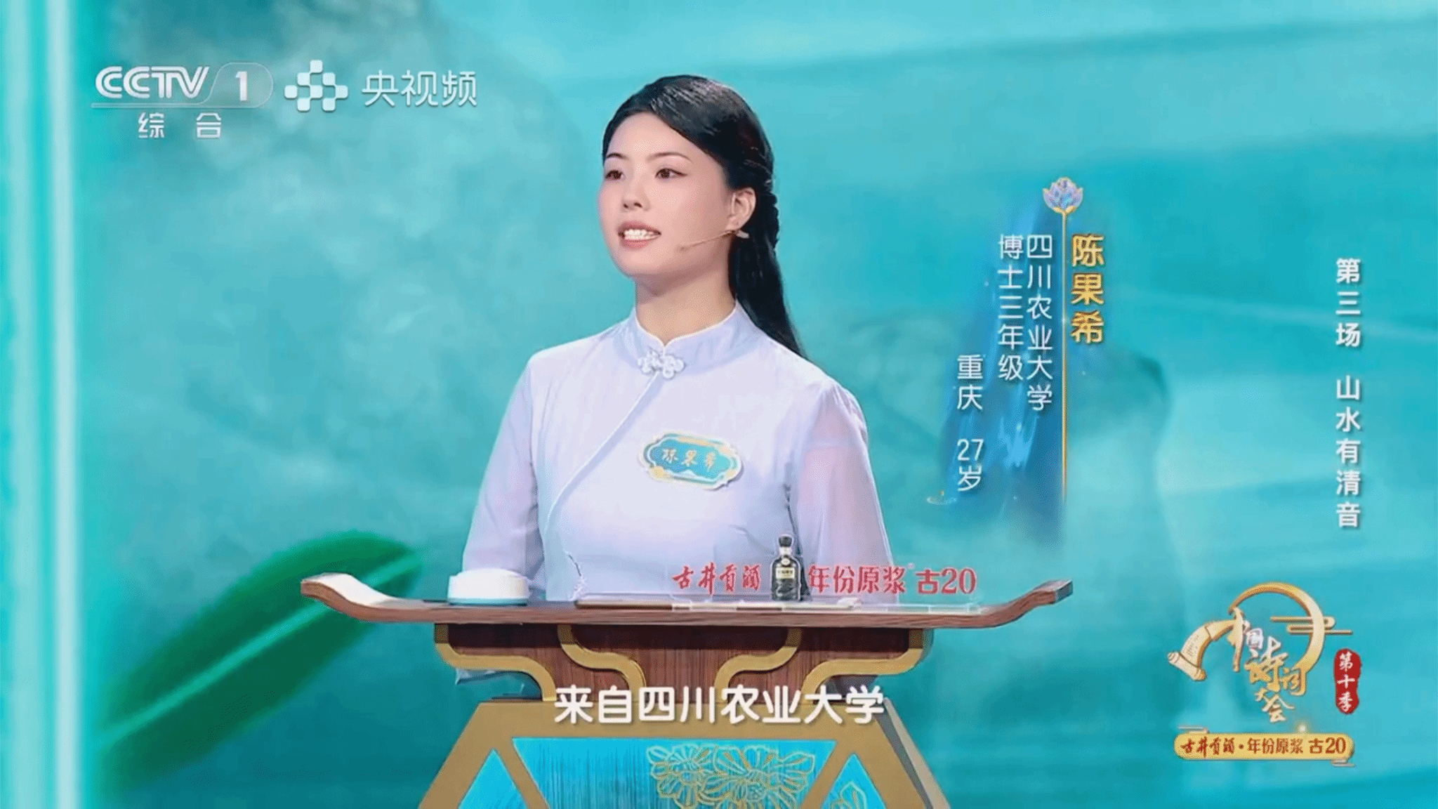 在1月18日CCTV-1首播的《中国诗词大会(第十季)》第三期节目“山水有清音”中,我校林学院2023级森林培育专业博士研究生、中共党员陈果希登台亮相,不仅展现“既通草木,亦晓诗韵”的独特风采,也折射出我校林业学科深厚的人文内涵与当代青年学子的多元素养。