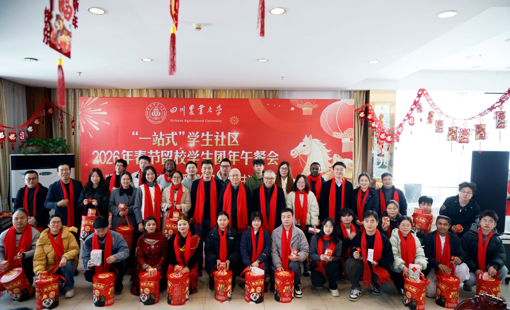 2月11日,农历腊月廿四,南方小年。校园内红梅吐蕊、岁律更新,处处洋溢着喜庆祥和的节日氛围。2026年春节留校学生团年午餐会在三校区同时举行。校党委书记刘登才,校长吴德,党委副书记张强,分别在都江堰、成都、雅安三校区与相关职能部门负责人、各学院教师代表与二百余名中外留校学子欢聚一堂,共叙师生情谊,喜迎丙午马年 。