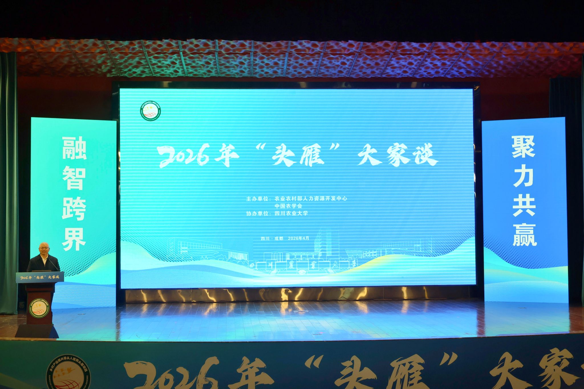 4月2日,由农业农村部人力资源开发中心、中国农学会主办,我校协办的2026年“头雁”大家谈活动在成都校区音乐厅举行。活动以“融智跨界、聚力共赢”为主题,系统总结“十四五”期间“头雁”项目培育成效,汇聚政产学研用各方力量,共同助力“头雁”成长,为乡村全面振兴筑牢坚实人才根基。